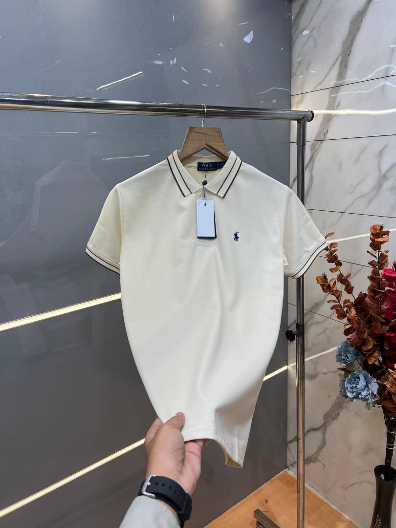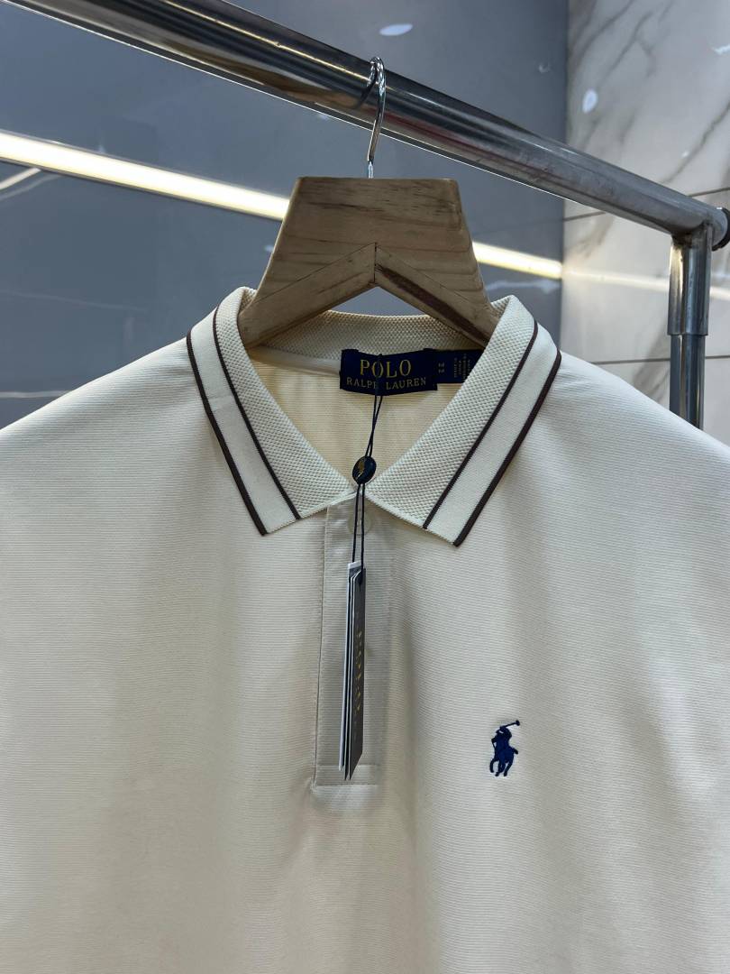 Ralp h Lauren Cream Premium Imported 240 GSM Interlock Lycra Fabric Polo Tshirt with Collar Design and Embroidered Logo 4060